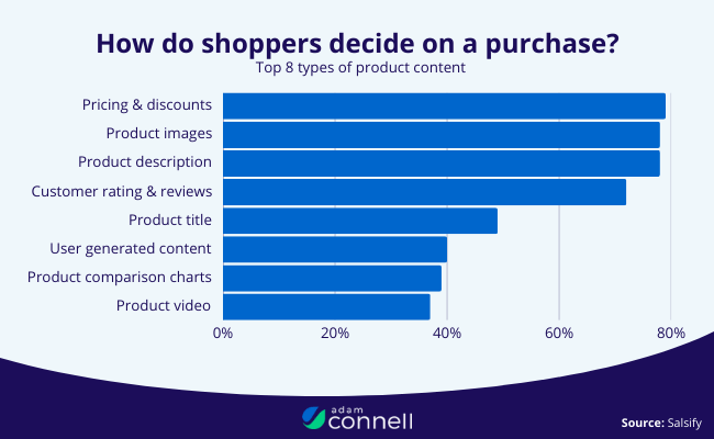 Check this out: when deciding whether or not to purchase, almost 80% of users check the pricing, discounts, product images and product descriptions.